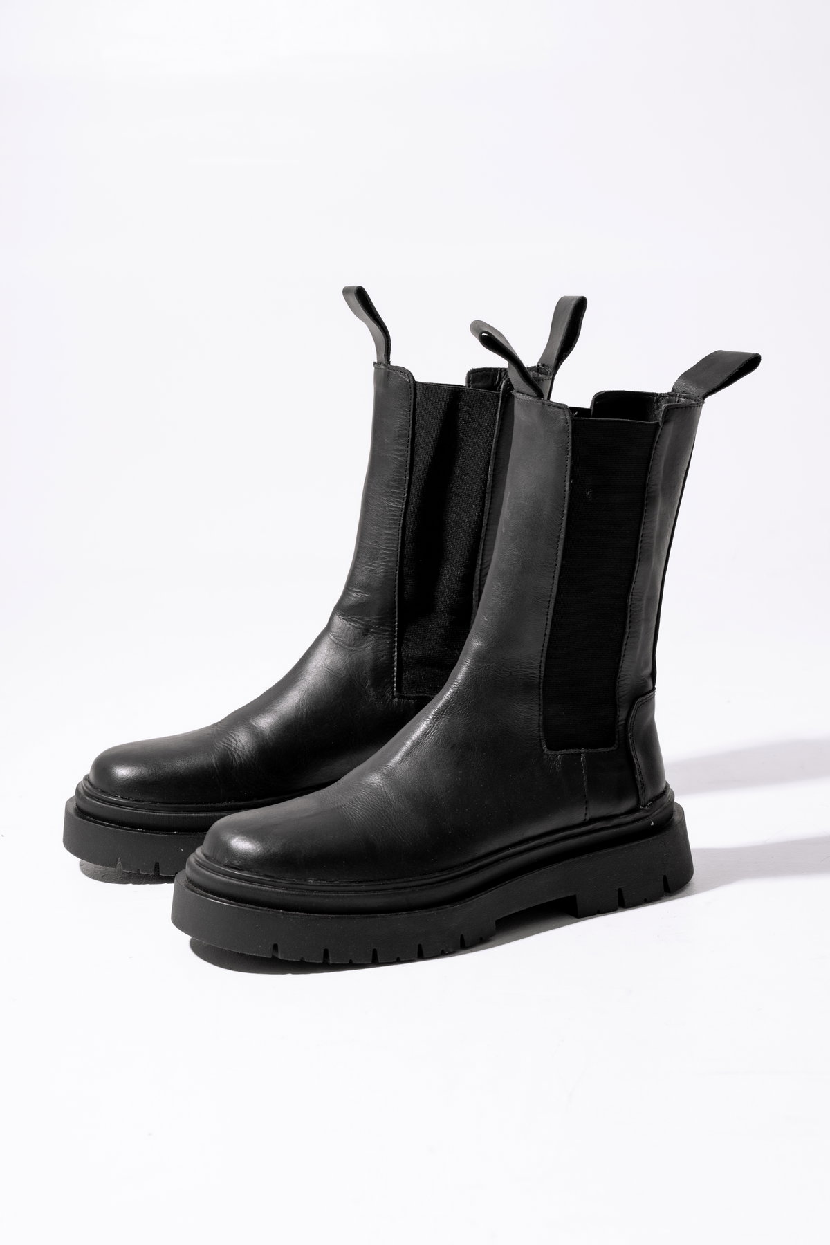 Borcego de cuero vacuno, con capellada de napa lisa. Base de TR. Elástico lateral italiano.